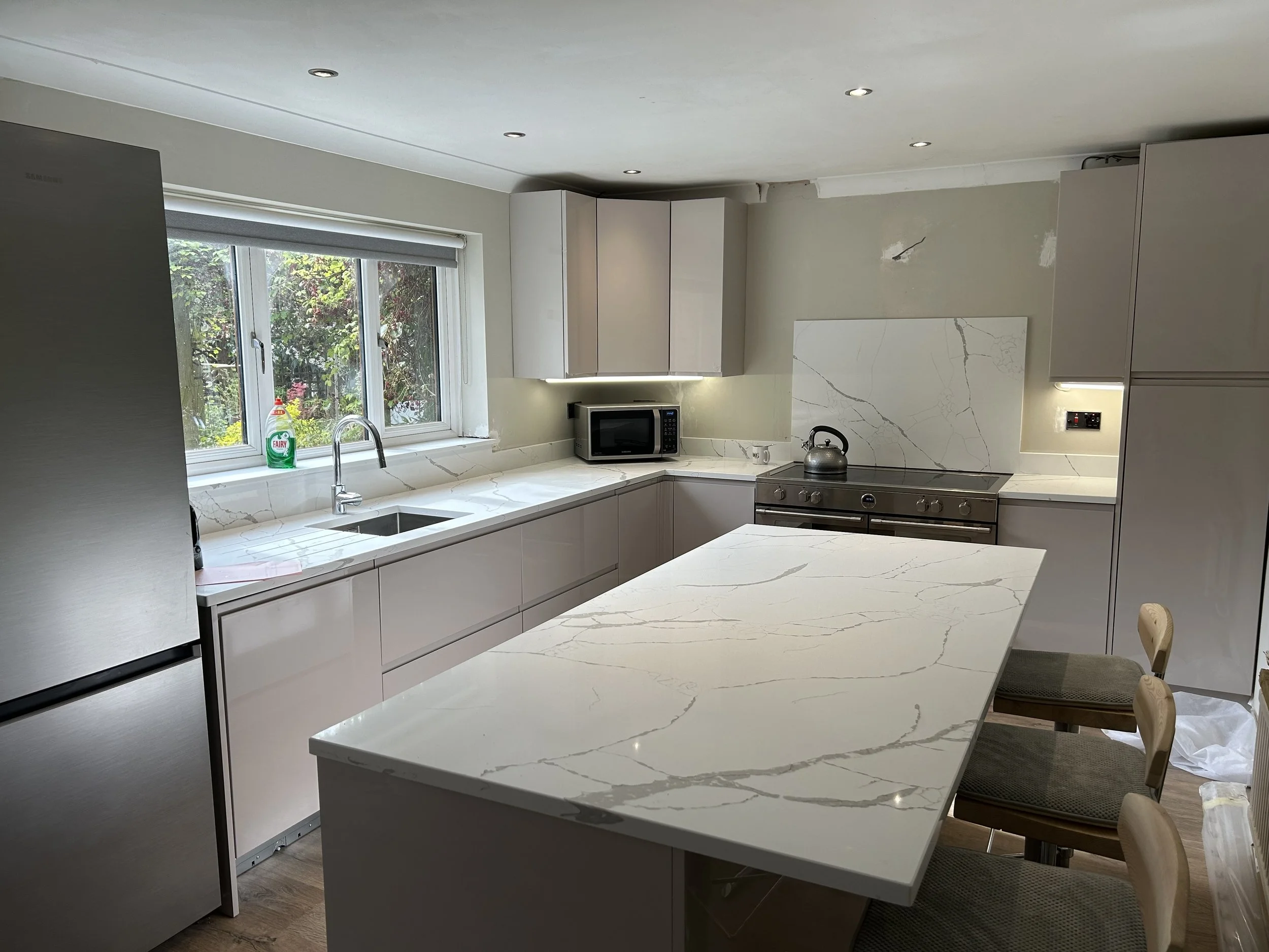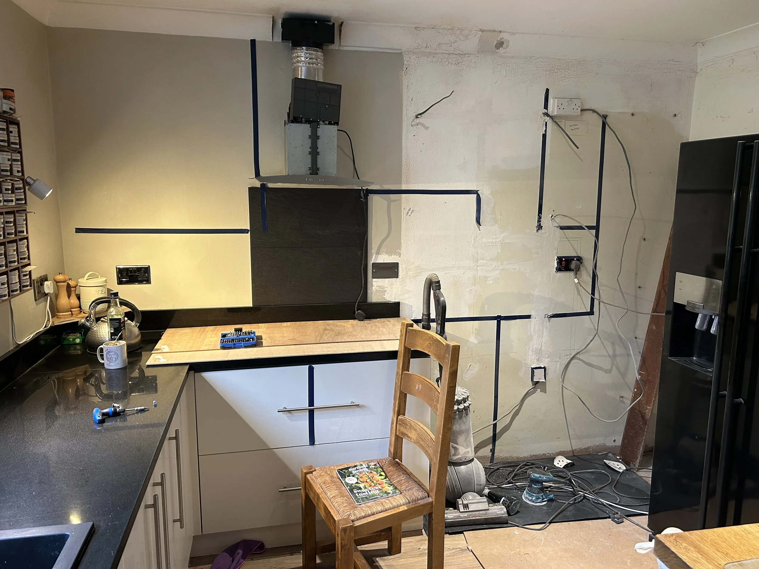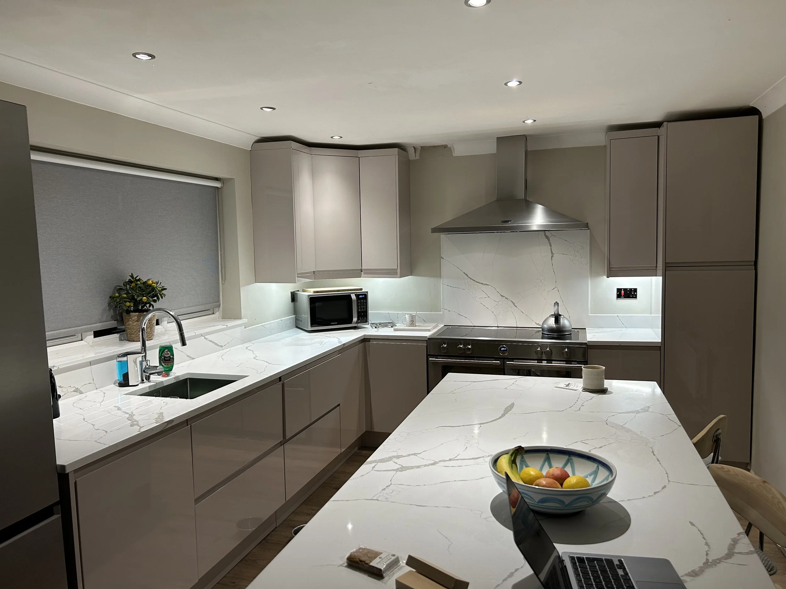 This was one of those “how hard can it be moments”. Turns out that it isn’t that hard. A discussion about a poorly designed old kitchen, design and order on diy-kitchens and a few weeks later we’ve a new kitchen! The new recessed lighting made a huge difference and yes I did fix the missing piece of coving!