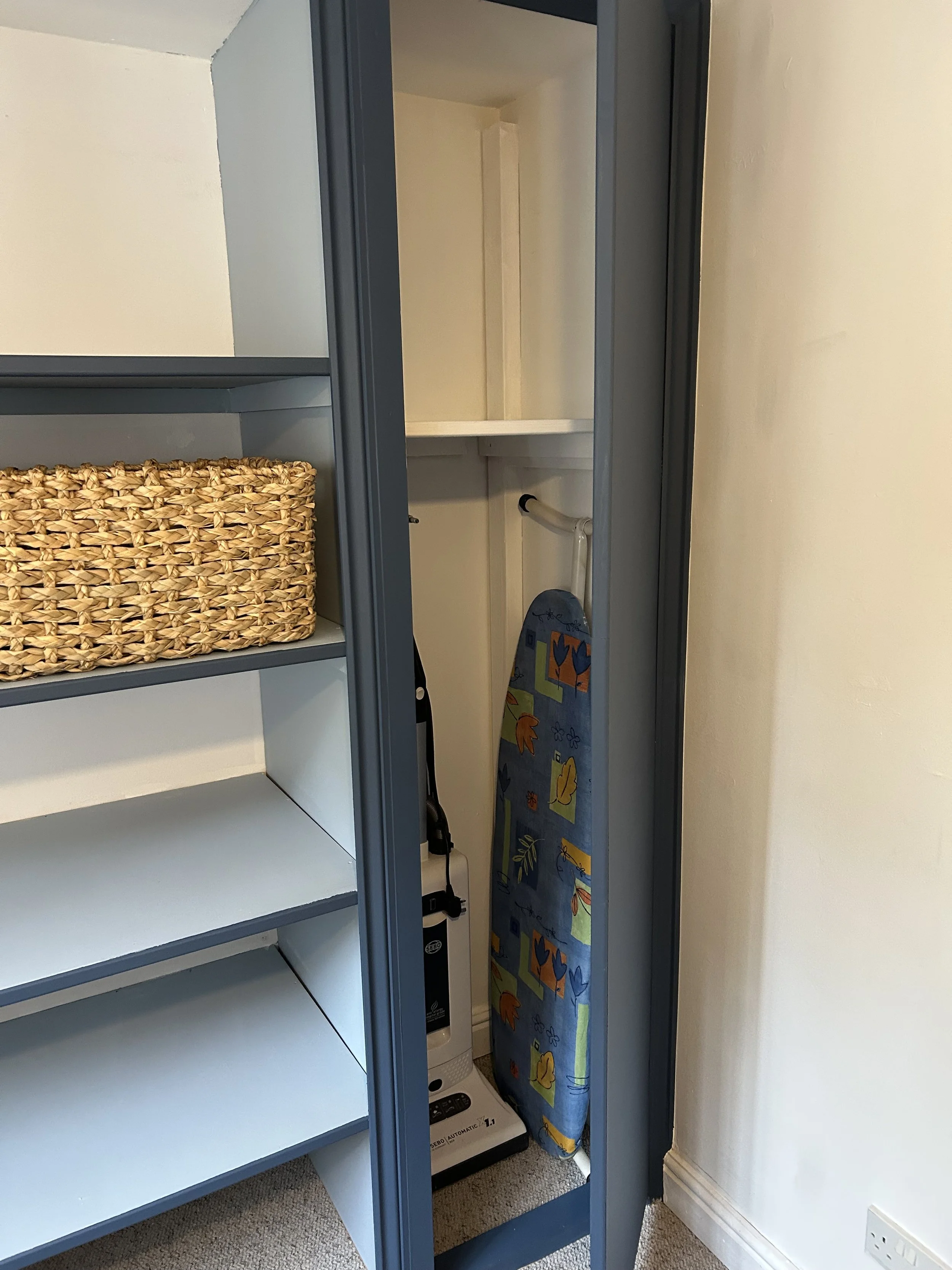 Best compromise ever? One half wanted a big TV the other didn’t. So we buried it to enable us to level the cupboard with the window sill, installed an electric lift and built a 2 door cupboard with oak offcuts.