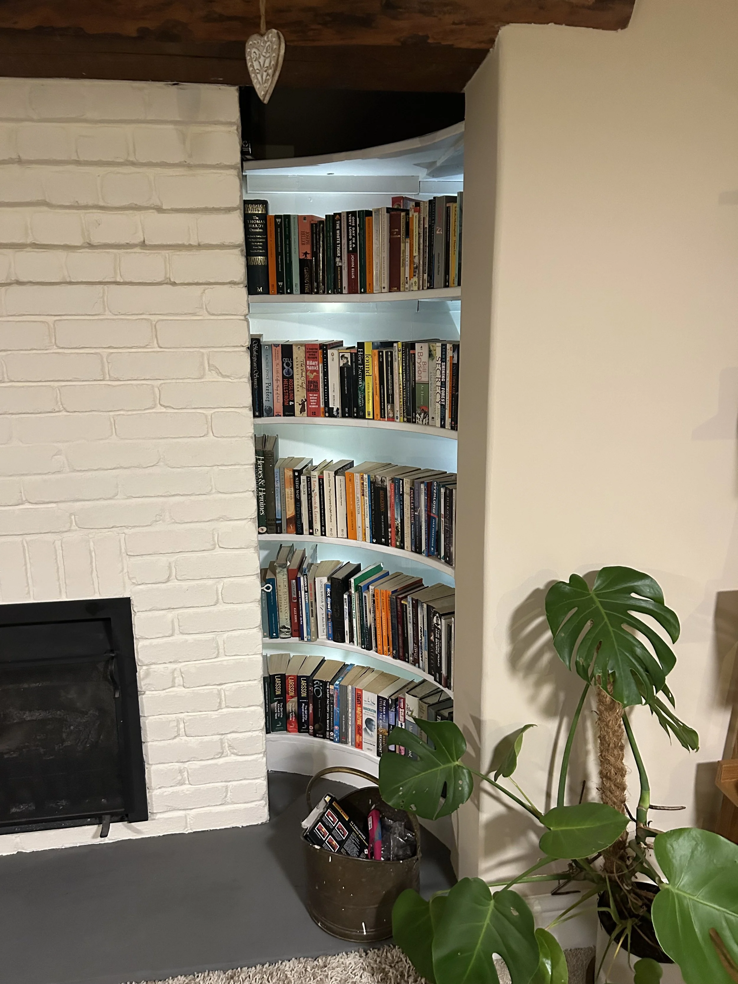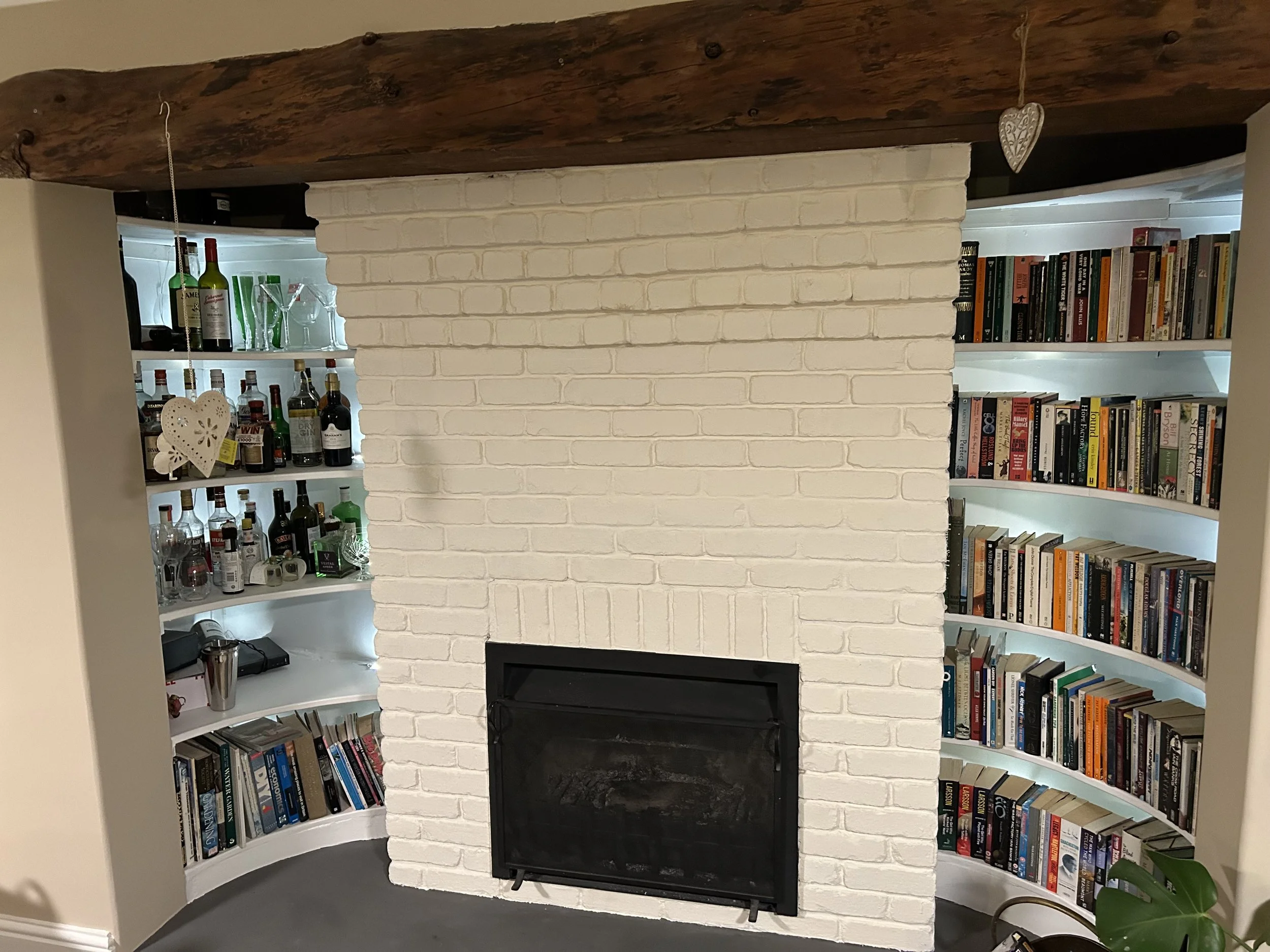 Here we built some curved shelving, added LED backlighting and concreted the hearth to really bring an inglenook fireplace to life. We also believe the ratio of drink to books is reasonable.