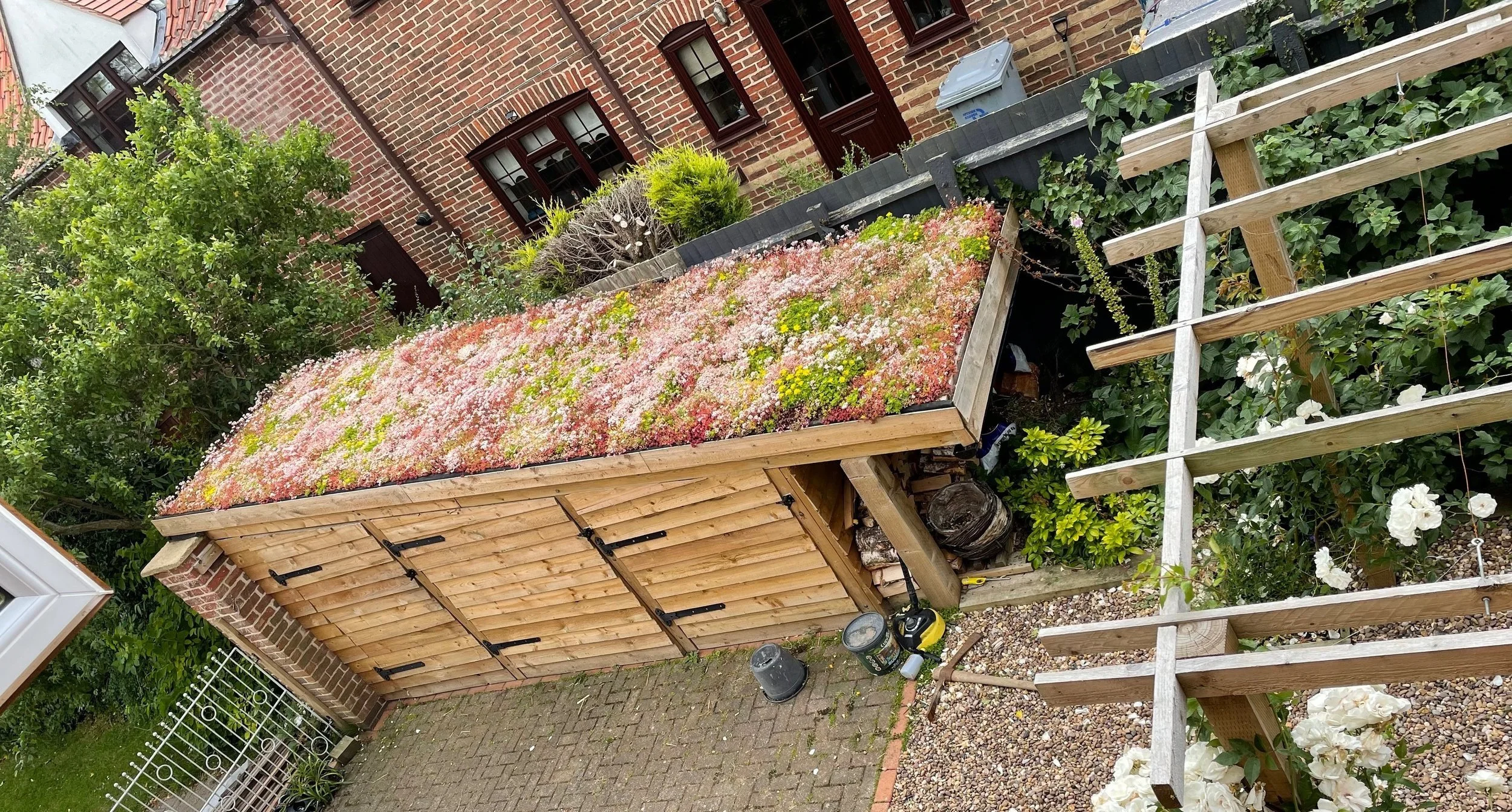 This was a really fun project. A tatty old store for some bins was replaced by a 3 bay shed, log store and a green roof.