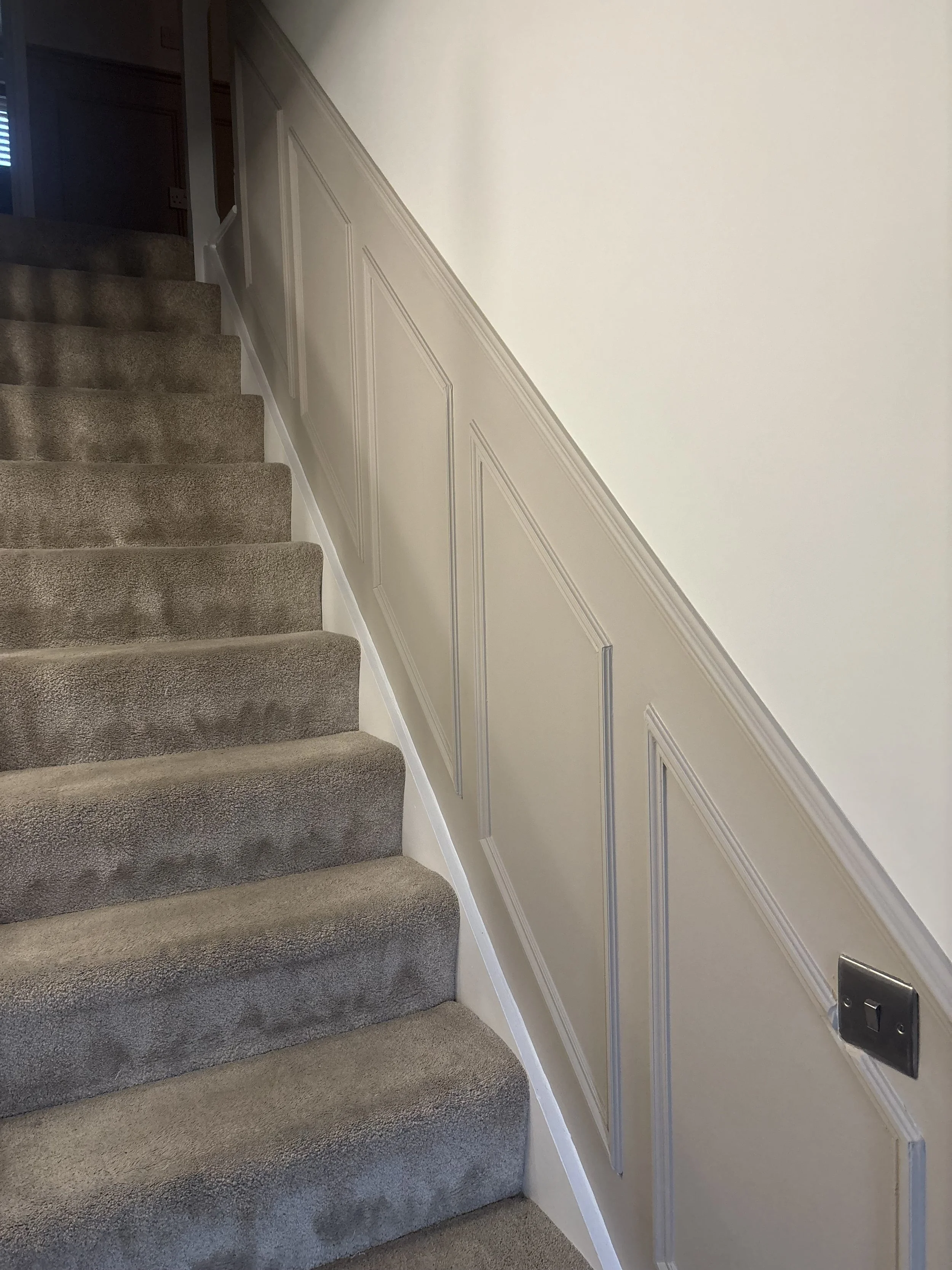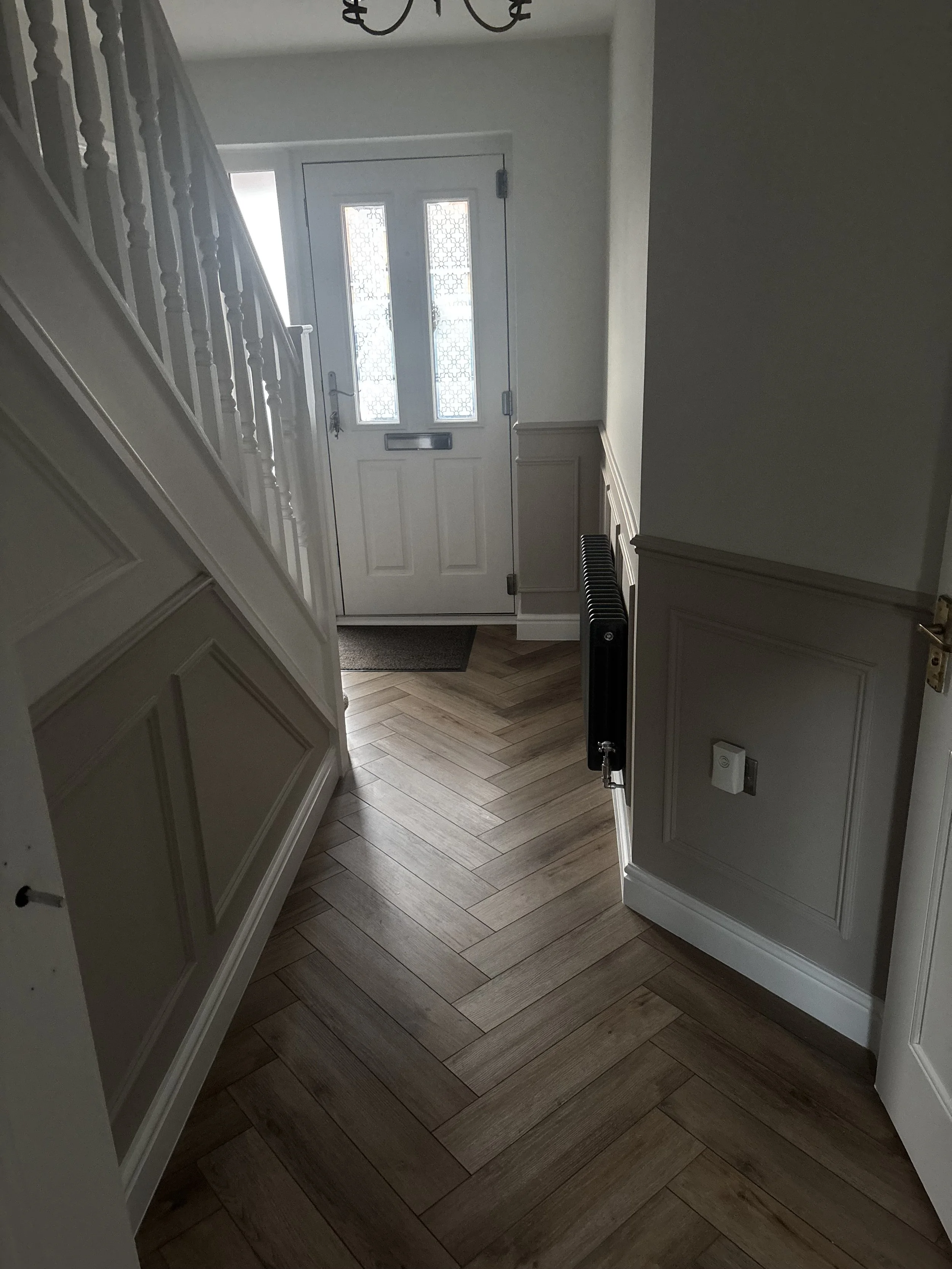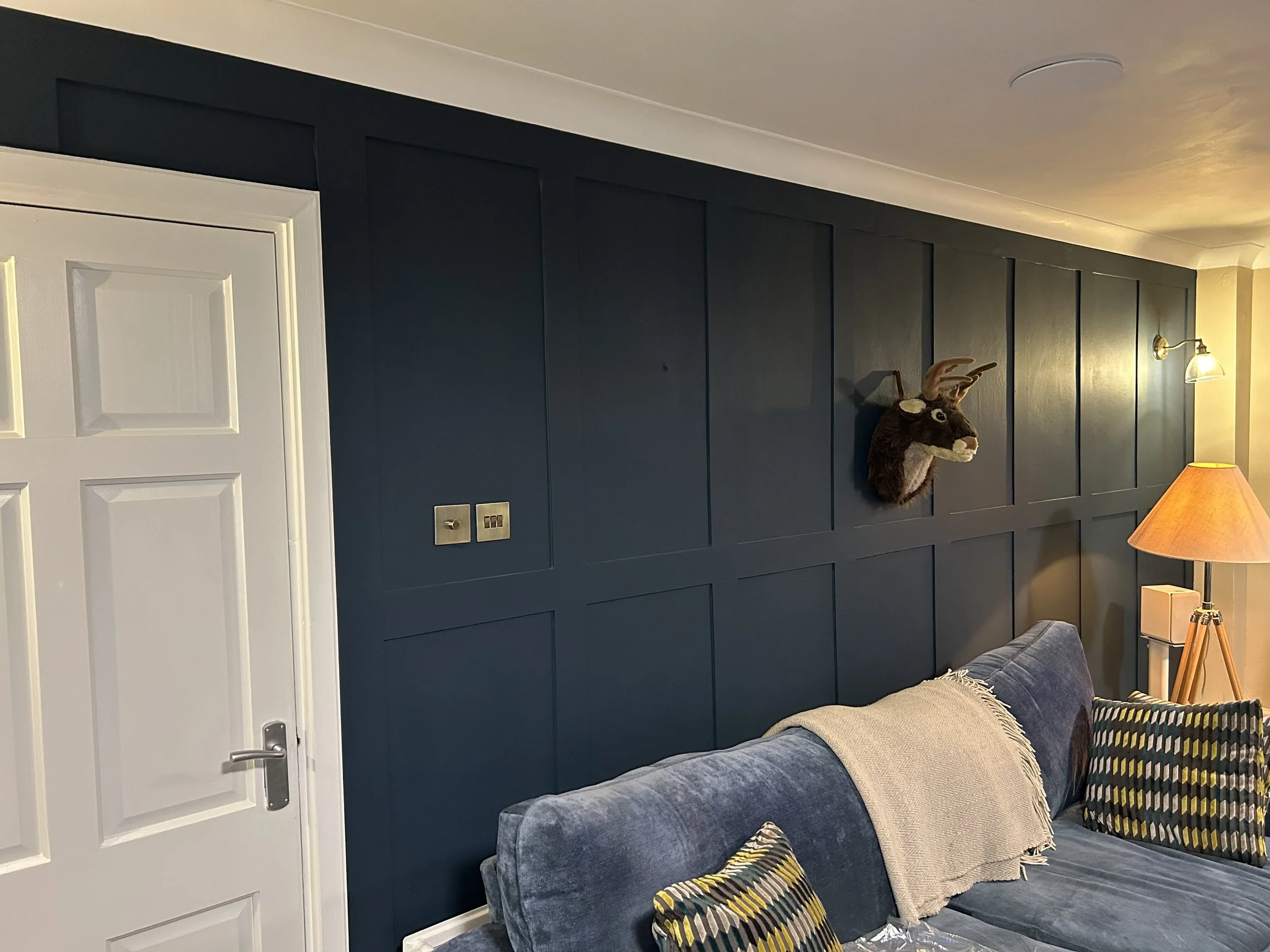 Panelling this one wall made a great feature to a living room. Reindeer head optional. We added the lights, moved sockets and replaced all the fittings. More traditional panelling and a dado rail transformed the hall and stairs.